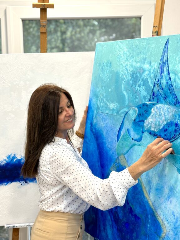Françoise Dagorn est une artiste peintre française inspirée par l’océan. Après avoir vécu vingt ans dans des îles ou régions côtières, elle a développé un univers artistique profondément lié à l’océan et à sa biodiversité marine.