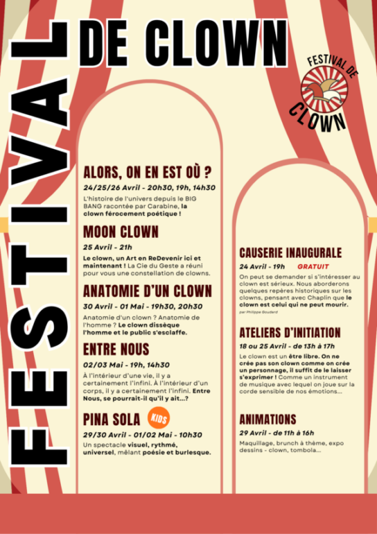 Le théâtre Beaux-Arts Tabard présente son tout premier festival de clown. Du samedi 18 avril au samedi 2 mai, des ateliers, activités thématiques et spectacles se relaieront sous les projecteurs, pour un évènement qui s’adresse à toute la famille. Au micro, Lily Ramuzat et Maxence Dégardin dévoilent ce qui s’annonce durant ces deux semaines clownesques.
